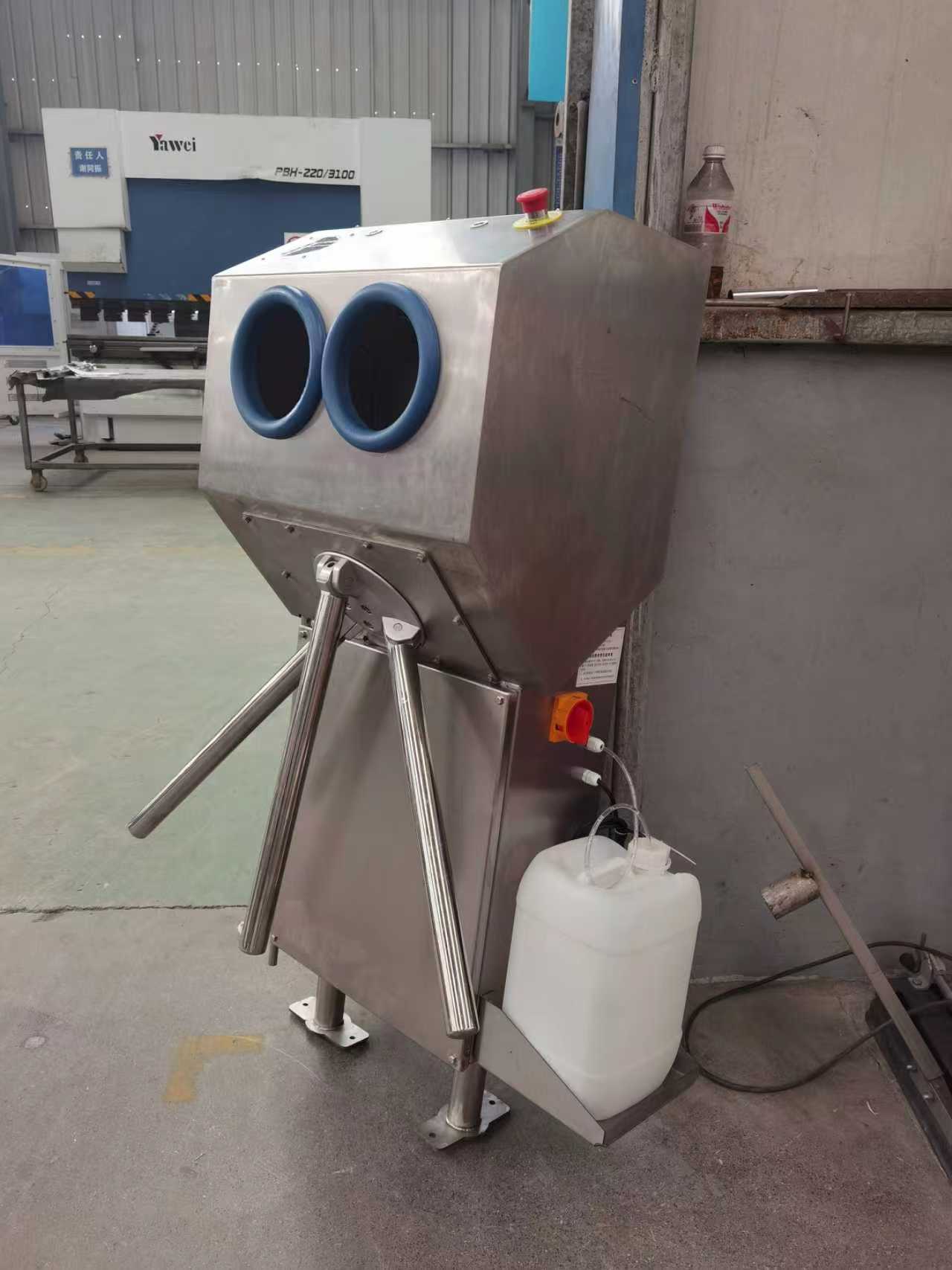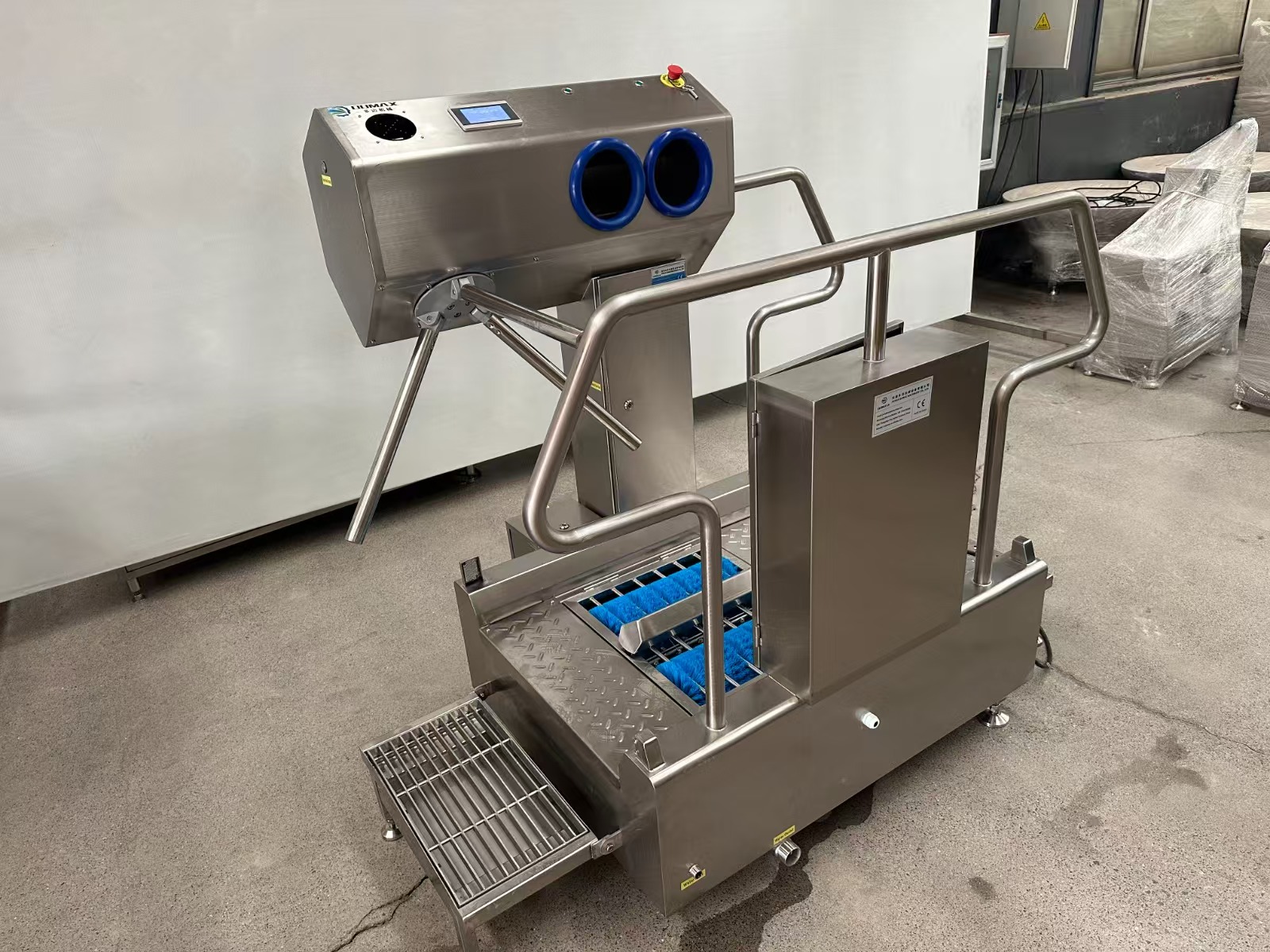 มีที่กั้นสามขา เพื่อบังคับการทำความสะอาดส่วนบุคคลให้เรียบร้อยก่อนเดินลงจากเครื่องล้างรองเท้า