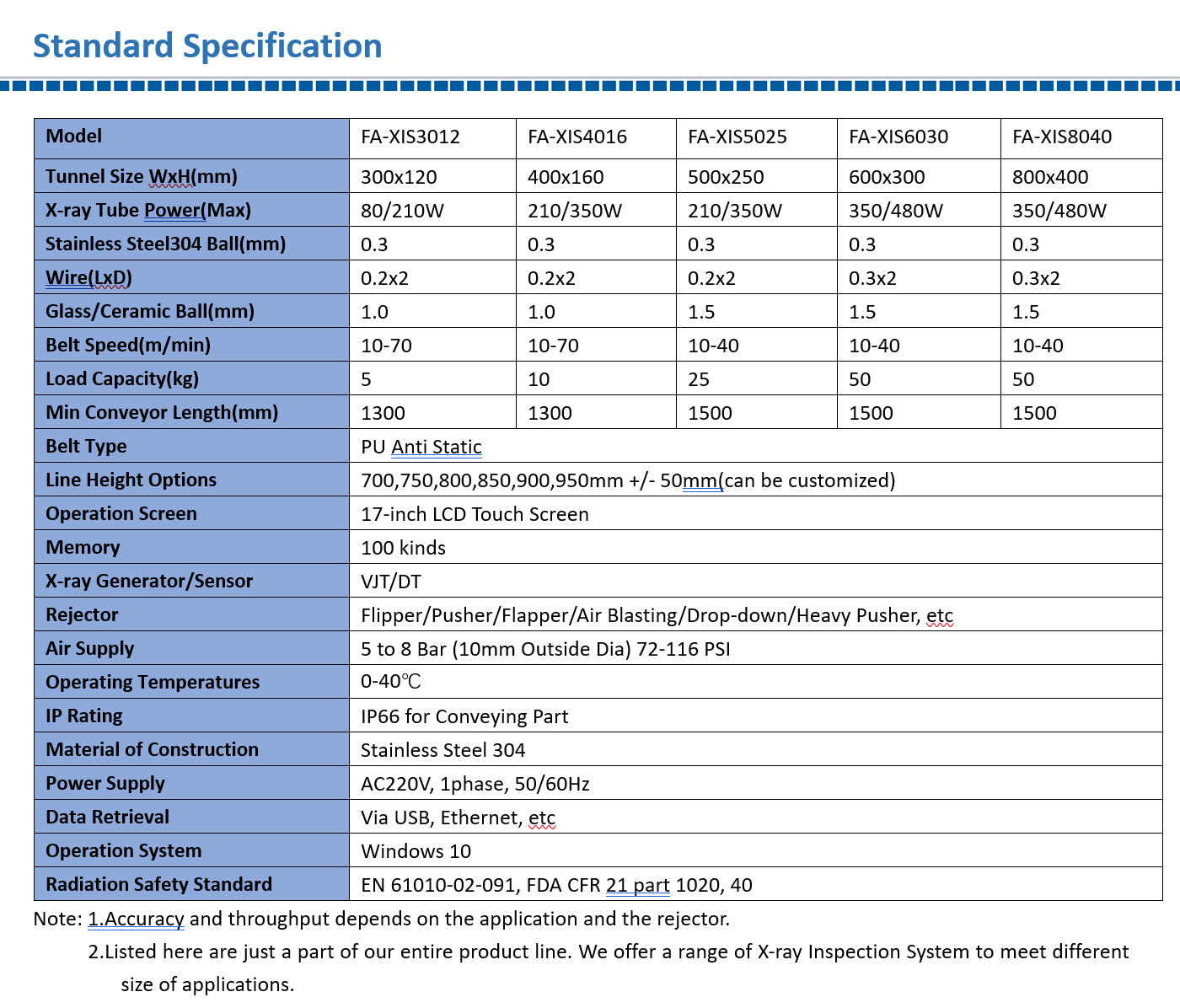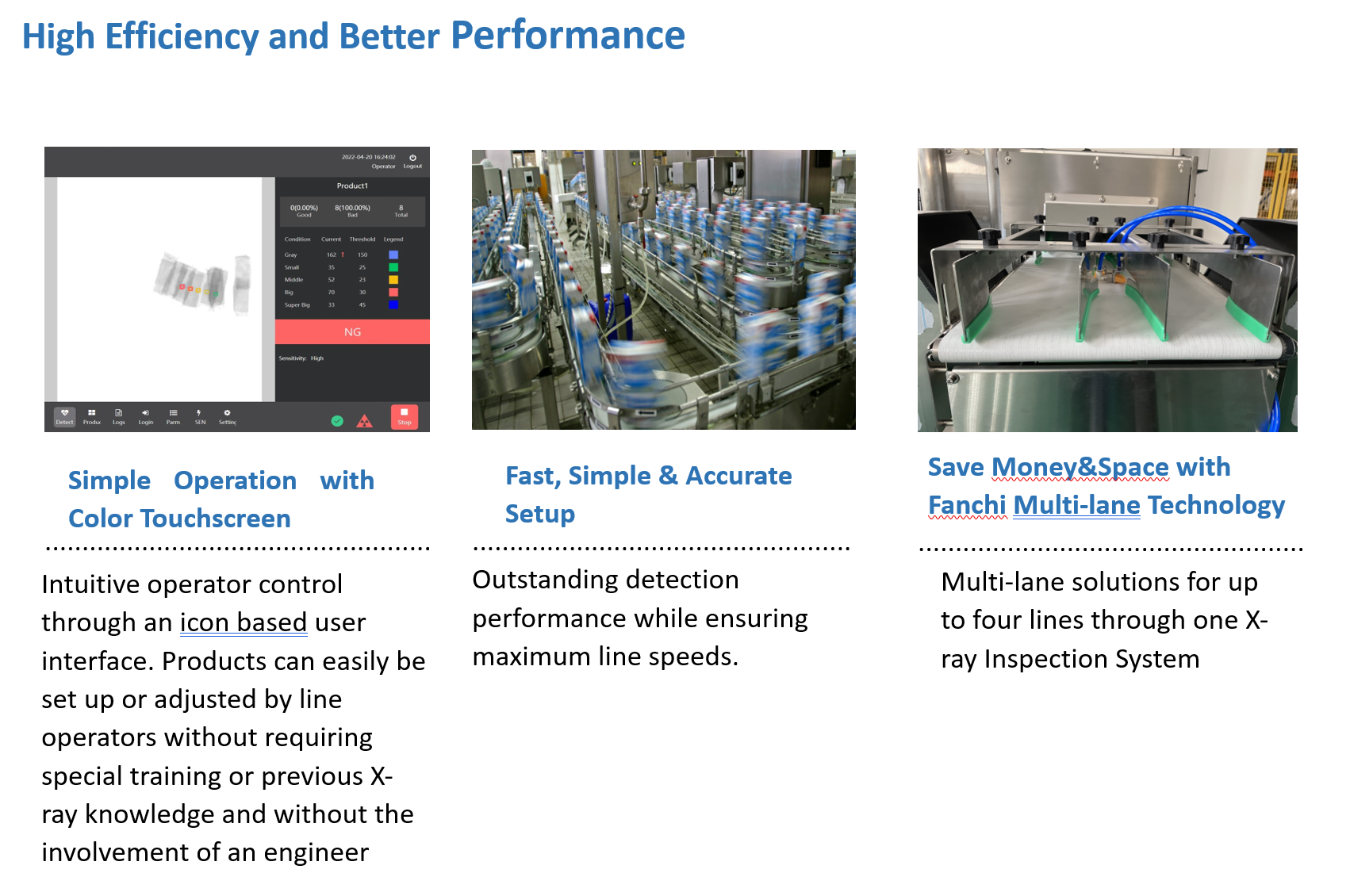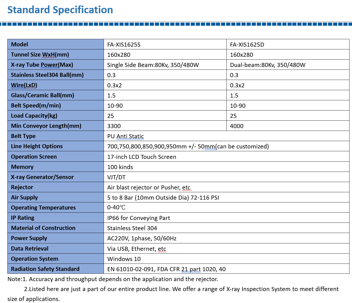 Fanchi Dual-beam x-ray system is specially designed for the complicated detection of glass particles in glass or plastic or metal containers. It also detects unwanted foreign objects such as metal, stones, ceramics or plastic with high density in the product. The FA-XIS1625D devices use a scanning hight up to 280 mm with a straight product tunnel for conveyor speed up to 120m/min.