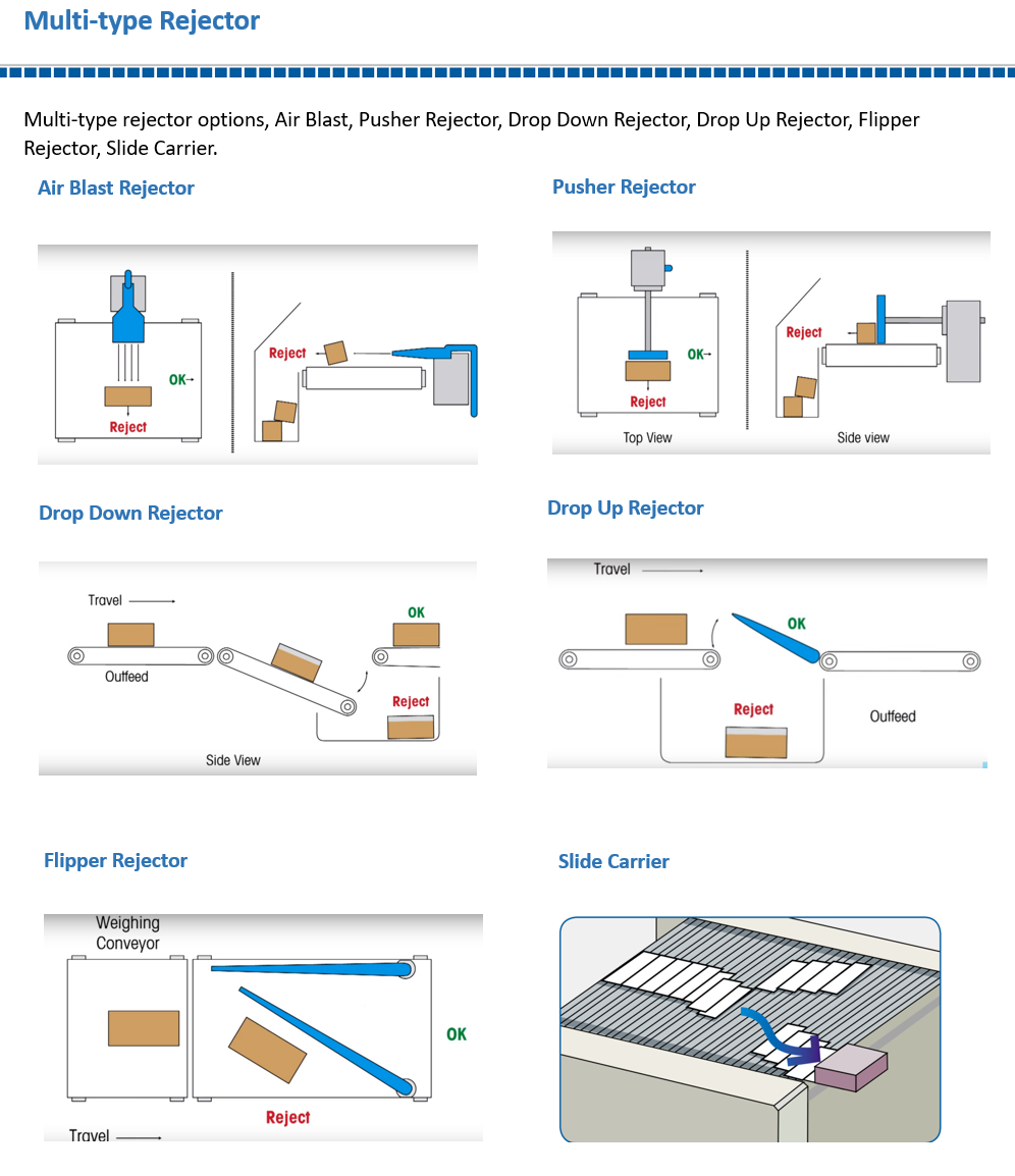 เครื่องชั่งน้ำหนักสายพาน/เครื่องตรวจสอบน้ำหนัก และเครื่องตรวจจับโลหะของเรา ผู้ใช้สามารถเลือกติดตั้ง Rejector ตามแบบด่านล่างให้เลือกใช้ตามความเหมาะสมของขนาด น้ำหนัก ของสินค้าที่ผ่านเครื่องตรวจของเรา
