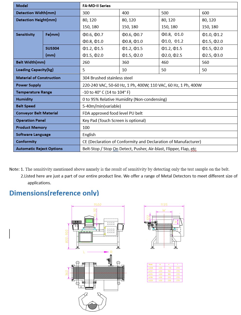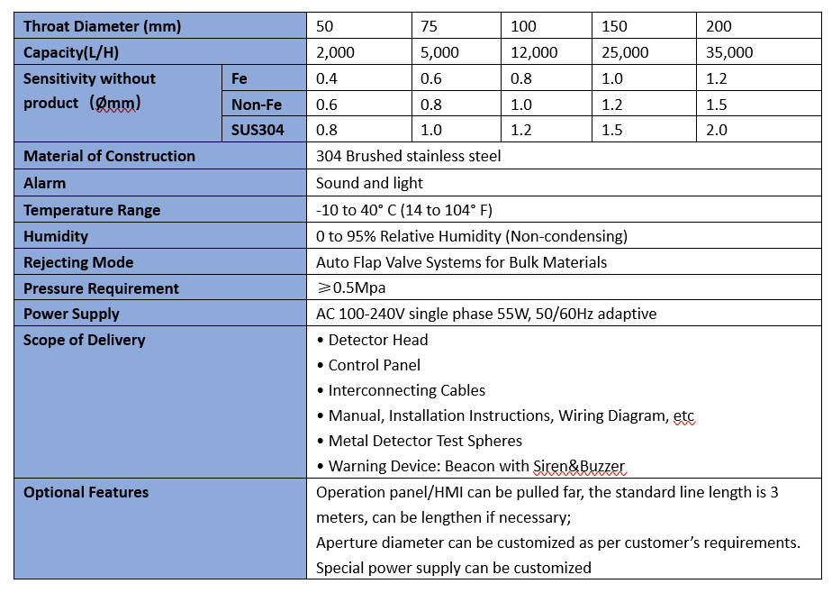 เครื่องตรวจจับโลหะรุ่น FA-MG-T หรือเครื่องตรวจจับโลหะแบบปล่อยตกเป็น Metal Detector ที่ทำการตรวจโลหะปนเปื้อนในอาหารหรือวัสดุอื่นจากการปล่อยวัสดุตกลงมาจากกรวยด้านบน (Free Fall) โดยเป็นที่นิยมใช้กับอาหารประเภทแป้ง น้ำตาล เมล็ดธัญพืข โดยอุโมงค์ด้านในจะมีขนาดค่อนข้างเล็ก จึงทำให้สามารถตรวจจับโลหะได้ค่อนข้างเล็กเป็นพิเศษ โดยวัสดุทุกส่วนส่วนจะเป็น Stainless Steel 304 หรือวัสดุที่เป็น Food Grade ทั้งหมด