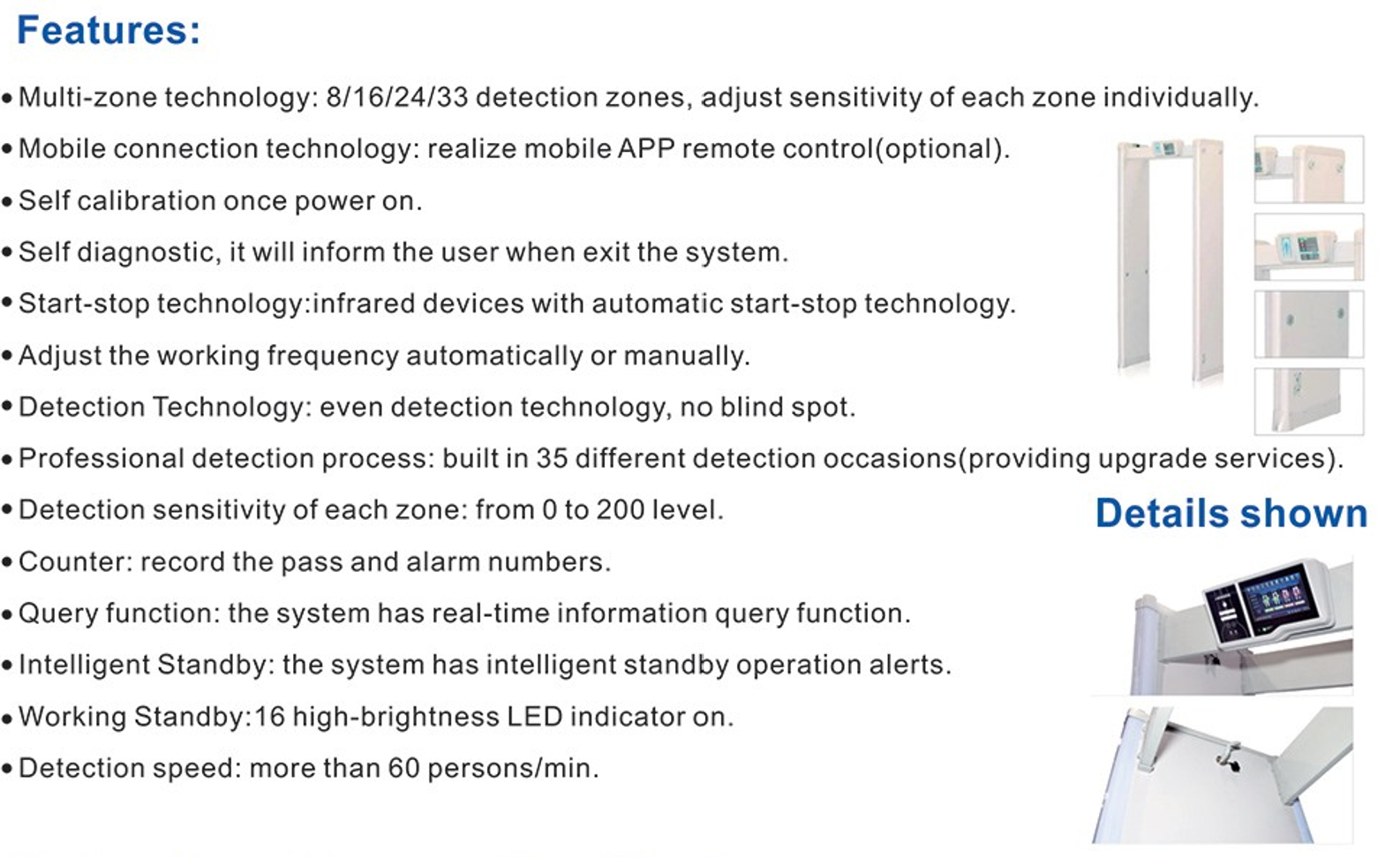 Accurate alarms for mobile phones and digital products, places where belt buckles and other small items do not alarm: National/provincial/city/county standardized examination room, national confidential institutions.
