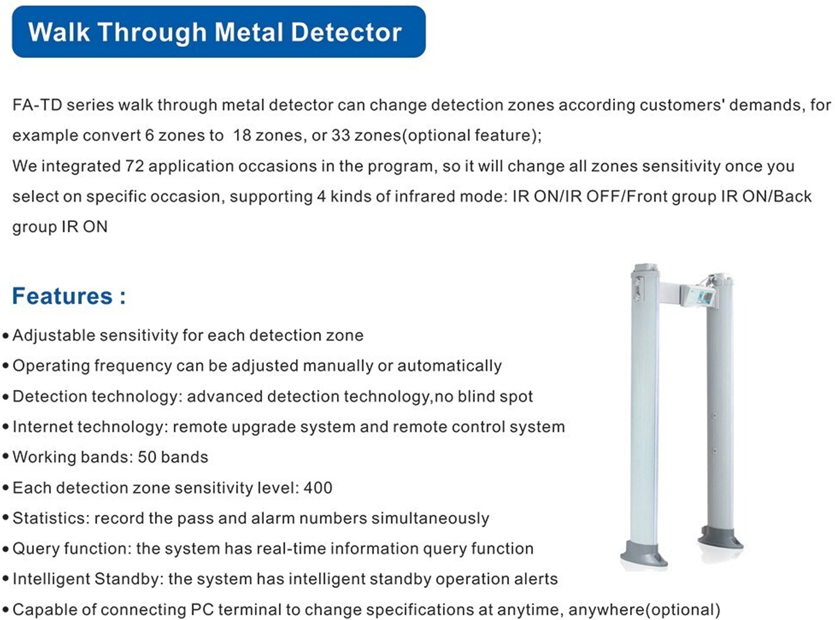ใช้หลักการทำงานคือตัวเครื่องจะสร้างสนามแม่เหล็กไฟฟ้าในช่องทางเดินผ่าน และใช้ซอฟแวร์อันชาญฉลาดในการแยกแยะระหว่างโลหะ และตัวบุคคลที่เดินผ่านเข้ามา เครื่องตรววจับโลหะแบบเดินผ่านของเรามีการออกแบบชอฟแวร์ให้มีการตรวจจับโลหะได้หลายหลาย Application เช่น สามารถจดจำใบหน้า ตรวจจับอุณหภูมิของคนที่เดินผ่าน ฟังชั่นในการแยกแยะโลหะในชีวิตประจำวันกับโลหะที่คาดว่าจะเป็นอาวุธ